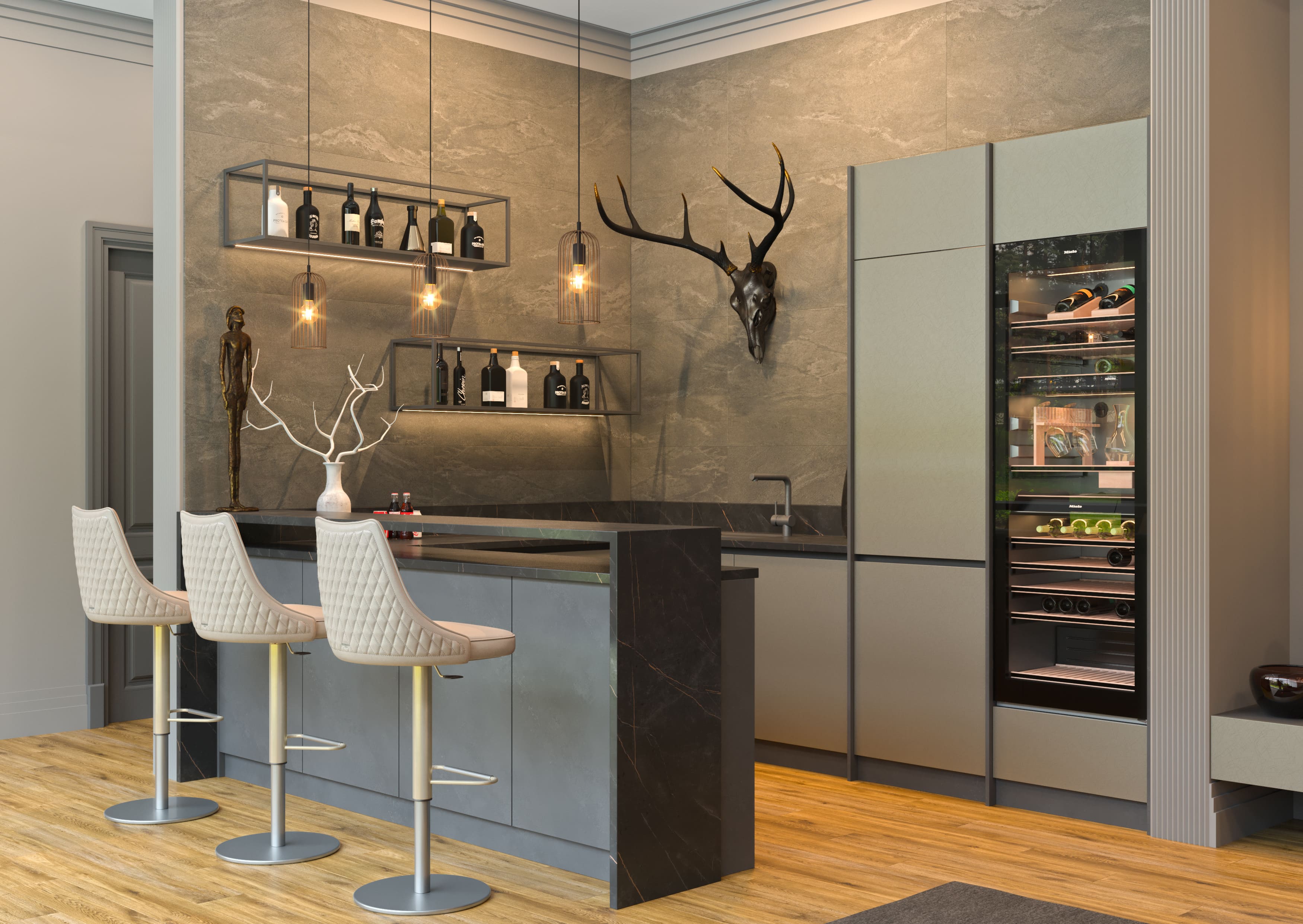 Архитектурные детали потолка и декоративные стеновые панели использовались для усиления глубины пространства. Теплая нейтральная палитра — тауп, мягкий бежевый и текстуры натурального камня — создает характер сдержанной элегантности.